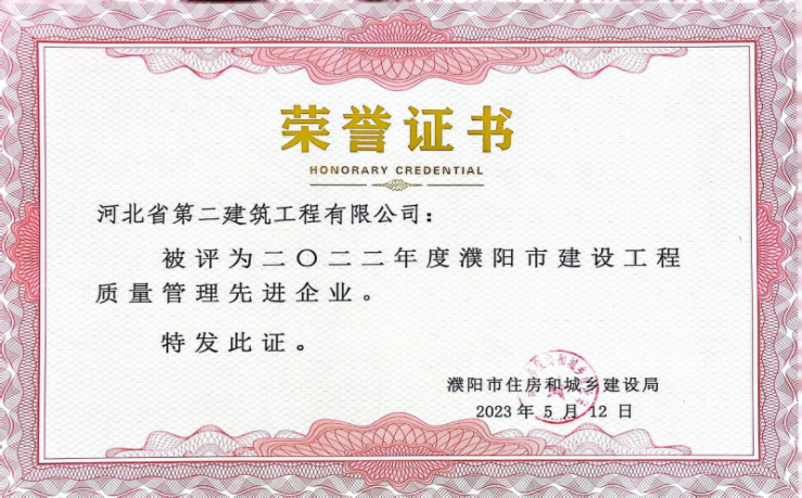 公司荣获濮阳市“2022年度建设工程质量管理先进企业”荣誉称号